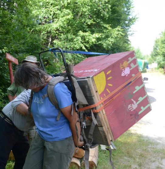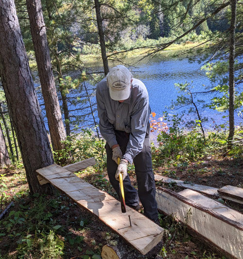 In 2025, the focus was to tell the story of Grande Chute. A view was cleared and a bench installed to let visitors imagine the spring log drives. The River Drive Camp Trail was created, a 1- kilometre interpretive trail that reveals the busy log drivers camp at the portage takeout. Friends of Dumoine reconfigured a trailer, donated by Zec Dumoine to showcase the hundreds of artifacts found on the trail or donated by visitors.