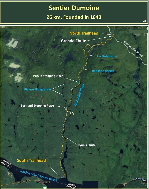 The Dumoine River is one of the last accessible undammed whitewater rivers in Canada, and it is renowned for its characteristics. But as of 2023, the Dumoine River can be explored on foot along a 26 kilometre hiking trail that is appealing to backpackers and day hikers alike. Thanks to the sterling efforts of Friends of Dumoine volunteers over a period of five years, an 1840s historic logging trail (tote road) has been rehabilitated and reopened. This new hiking trail follows the historic road for roughly half of the journey from the Ottawa River to Grande Chute, and it links to existing (ancient) river portages to follow closely to the Dumoine River. The rapids and chutes of the Dumoine are spectacular, and along the trail there are 26 new campsites and 4 side trails that lead to scenic lookouts. The Dumoine Valley has not been logged in over 100 years, so this trail system is through mature pine and hardwood forests.