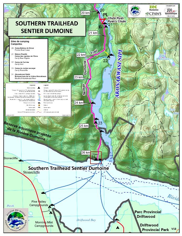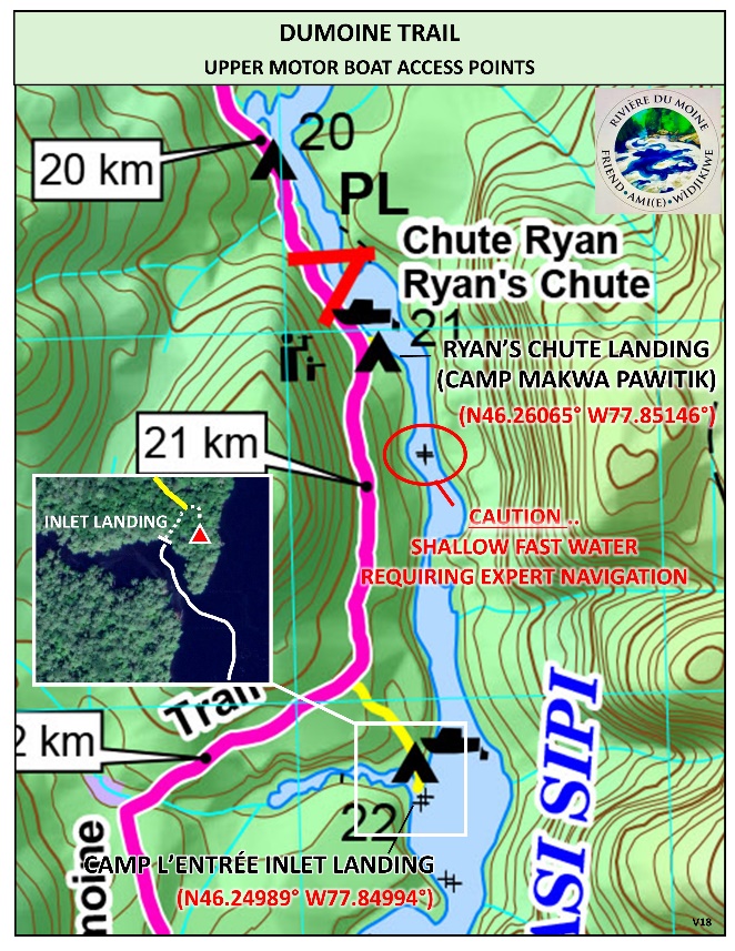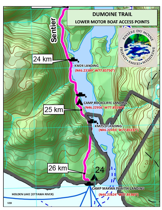 Accessing the south trailhead and other boat access points is also possible (and recommended) by purchasing motorboat shuttle service from two outfitter services in the area: Morning Mist Resort near Stonecliffe ON (613-586-1900 or 888-356-1113) and Les Guides de la Vallée Dumoine (outfitter) near Rapides des Joachims PQ (613-586-2300).