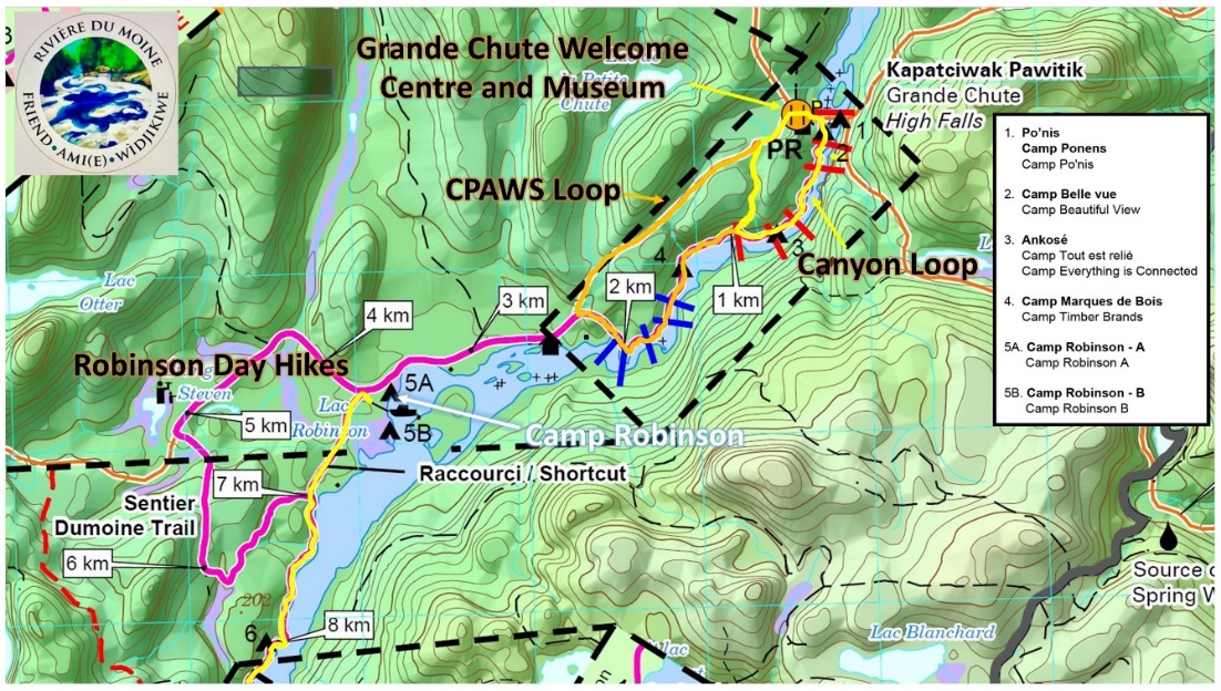 The “up and back” option it to hike north to Grande Chute, then back south to the starting point. To experience the entirely of Sentier Dumoine (i.e., to include time to explore the scenic lookouts at Southview Lookout, Bellevue Sud-Est, Bellevue Kickapika, Bald Eagle Cliff, and the Grande Chute), 4 or 5 days is recommended.