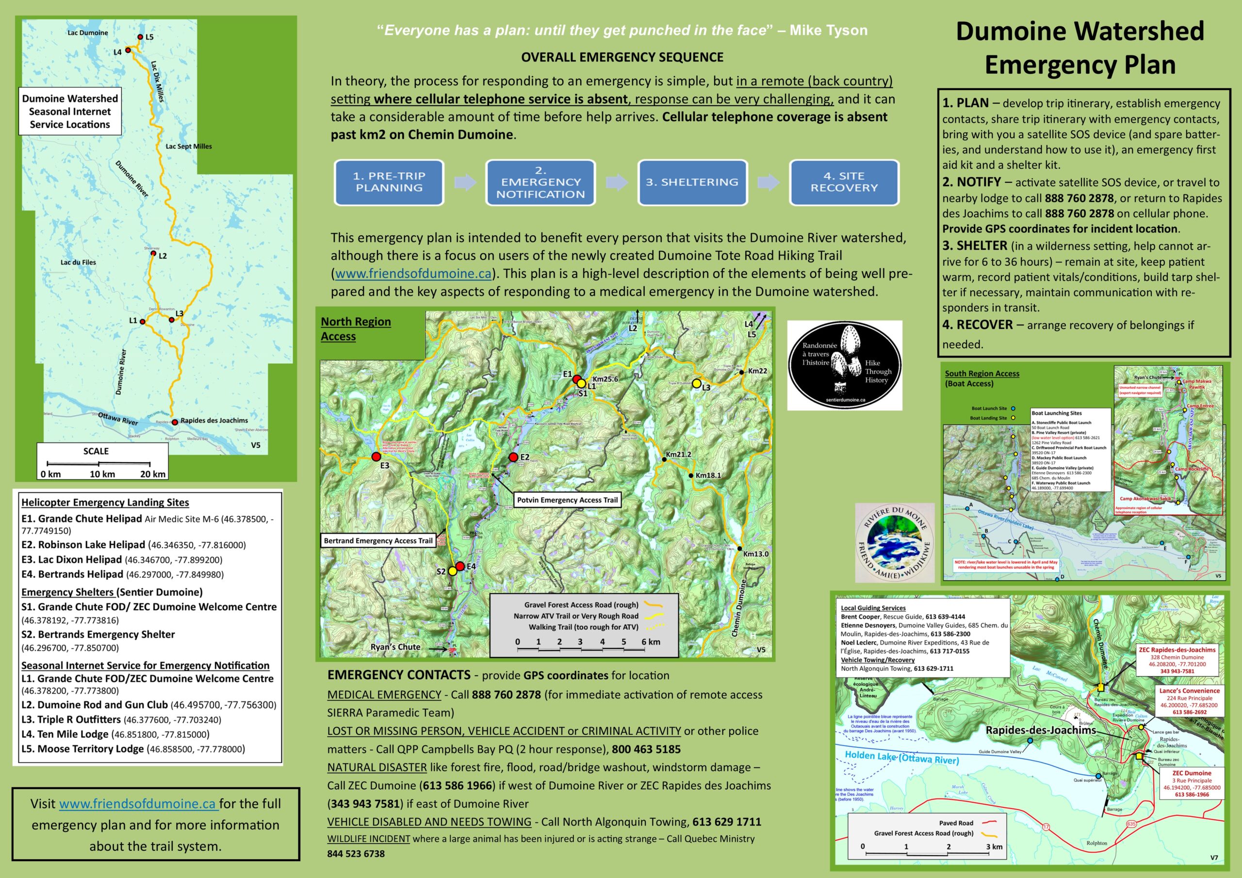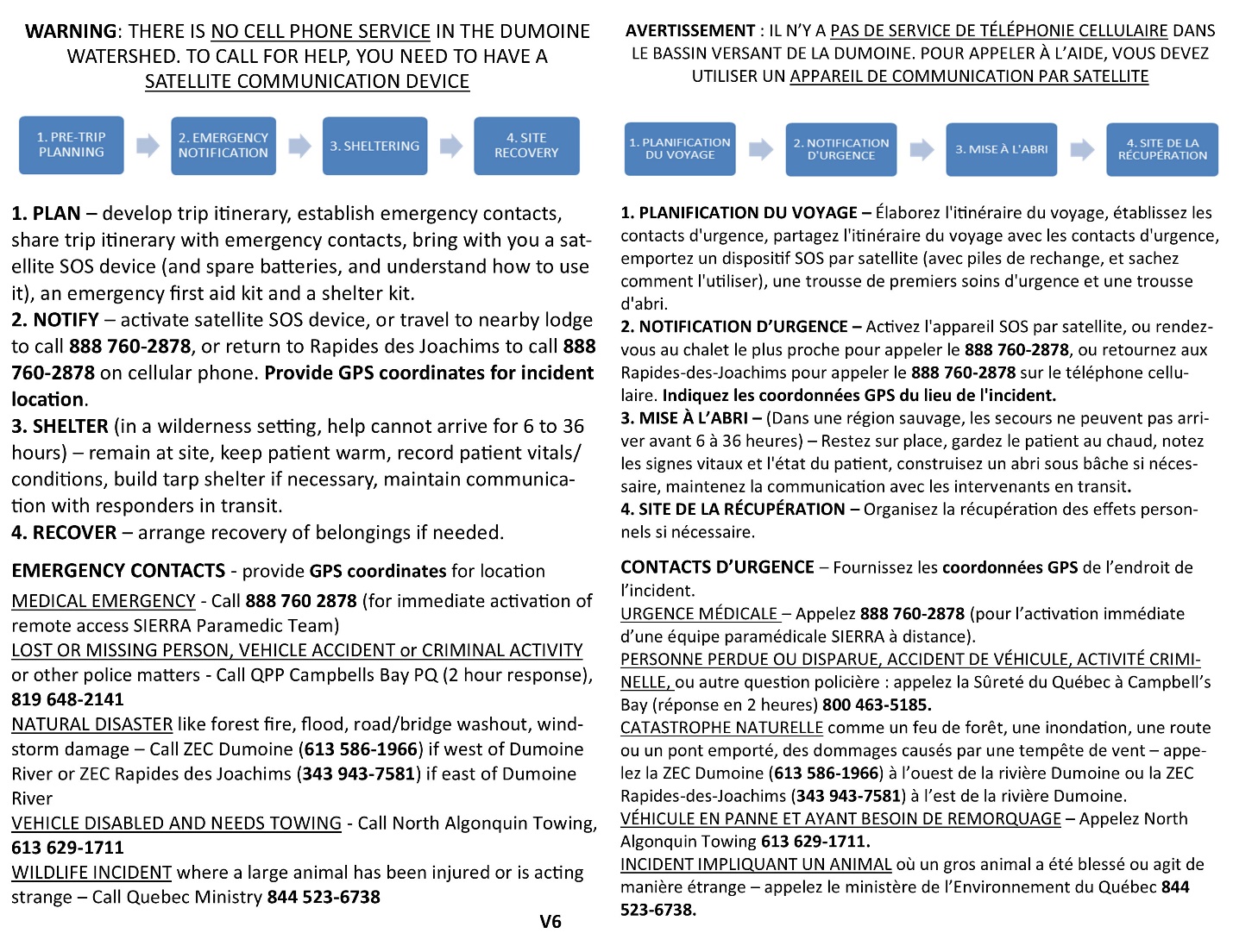 The Dumoine Watershed Emergency Plan is a practical safety guide created by Friends of Dumoine to help visitors prepare for and respond to emergencies in the remote backcountry of the Dumoine River watershed. Because cellular service is largely unavailable beyond km 2 on Chemin Dumoine and rescue response times can range from 12–36 hours, preparation and communication planning are critical.
